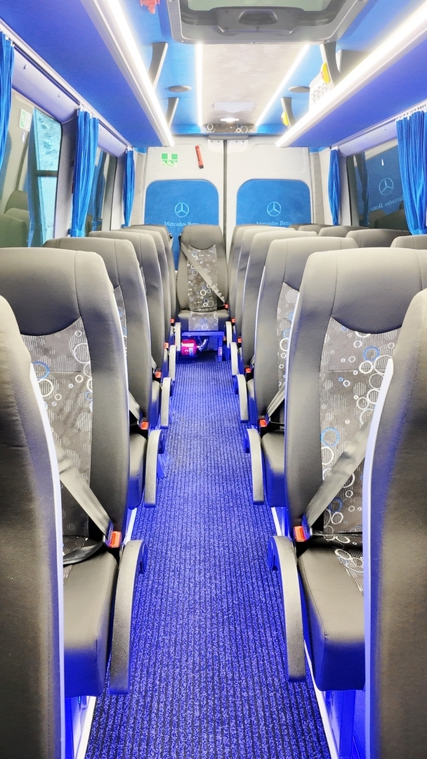 22+1+1 paikkaa korijatko 40 cm tasalattia matkustamon ovi MB vakio-ovi alaslasketulla kynnyksellä matkustamon ovi sähköinen ovenavaaja kuljettajan ovi pariovet takana taitettavat käsinojat istuinverhoilu kaksiväriverhoilulla kolmepisteturvavyöt oppaan istuin polttoainekäyttöinen moottoriveden lämmitin MB alkuperäinen termostaattiohjattu patterilämmitys lisälämpöpuhallin matkustamossa lämpö- ja äänieristetty matkustamo MB alkuperäinen etuilmastointi Matkustamon ilmastointi 5 kW höyrystin sähköinen ilmaventtiili katossa ( imu ) kattoluukku hattuhyllyt Tummennetut kaksikerroslämpölasit, kokopanoraama XXL yleisvalaistus himmentimellä ovivaloMatkustamo